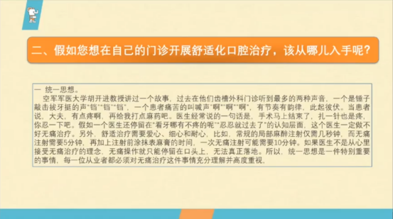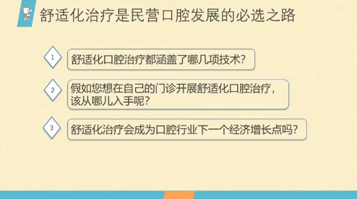 舒適化治療能幫我們留住忠實(shí)的患者,并進(jìn)行引流。那怎么樣去吸引患者?就是要靠口碑,要有一個(gè)特別有特色的地方:專業(yè)技術(shù)有保證、讓患者診療的全程都舒適。