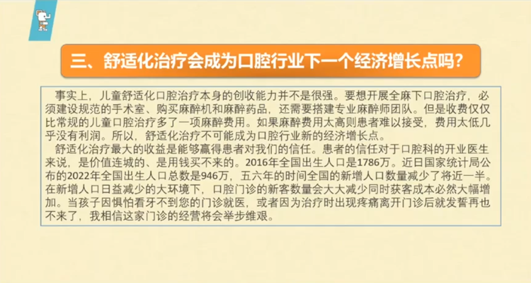 李院長(zhǎng)認(rèn)為舒適化治療不會(huì)成為口腔行業(yè)的下一個(gè)經(jīng)濟(jì)增長(zhǎng)點(diǎn)。舒適化治療是從門診環(huán)境、門診設(shè)備、到專業(yè)的麻醉醫(yī)師團(tuán)隊(duì)。麻醉費(fèi)用太高患者難以接受,費(fèi)用太低幾乎沒有利潤(rùn),所以舒適化治療不會(huì)成為口腔行業(yè)新的經(jīng)濟(jì)增長(zhǎng)點(diǎn)。