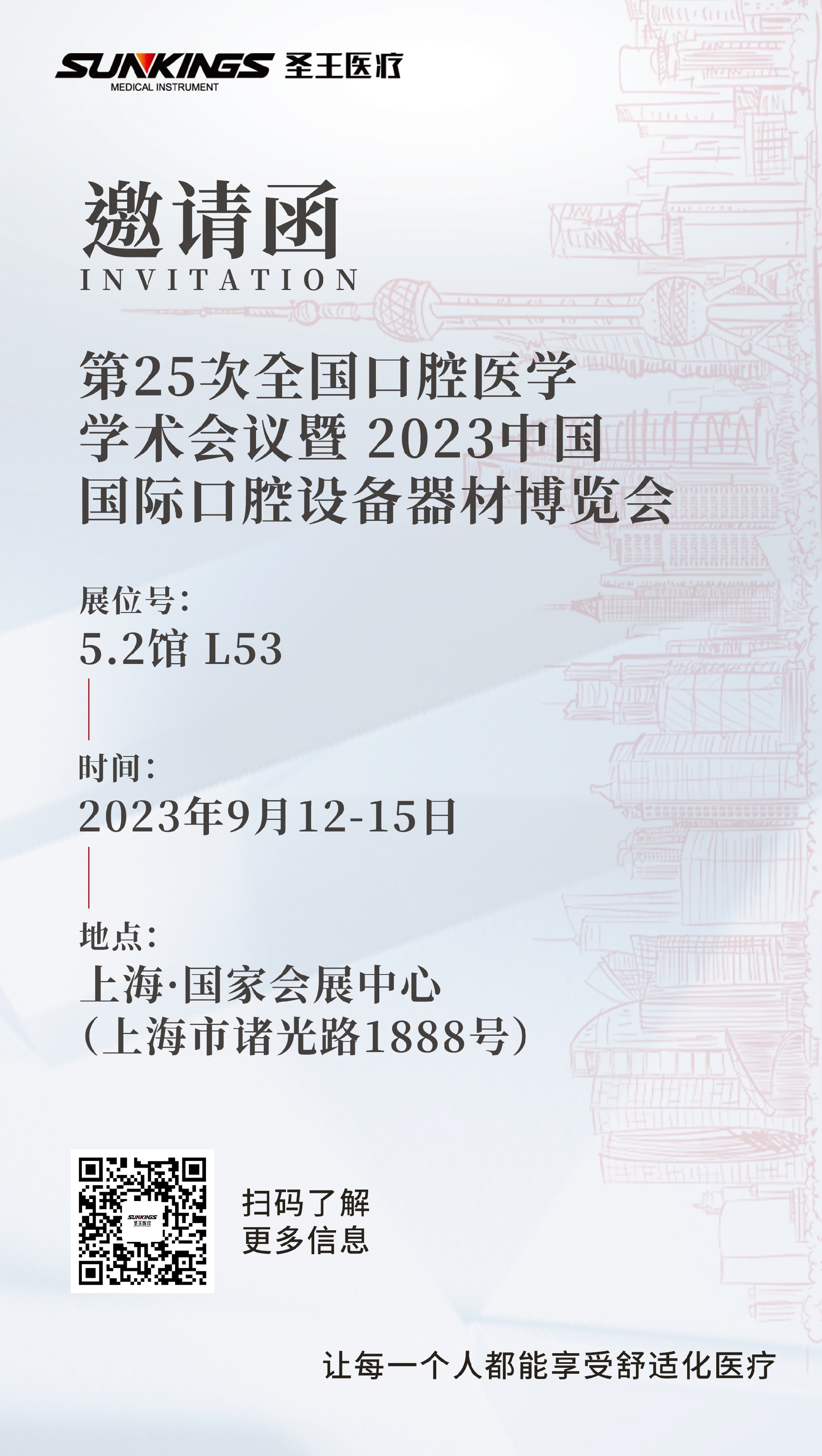 圣王醫(yī)療將于9月12至15日,在上海·國家會議中心參展第25次全國口腔醫(yī)學學術(shù)會議暨2023中國國際口腔設(shè)備器材博覽會,展位號:5.2館 L53,在此誠摯地邀請全國各界的伙伴們,蒞臨現(xiàn)場。
