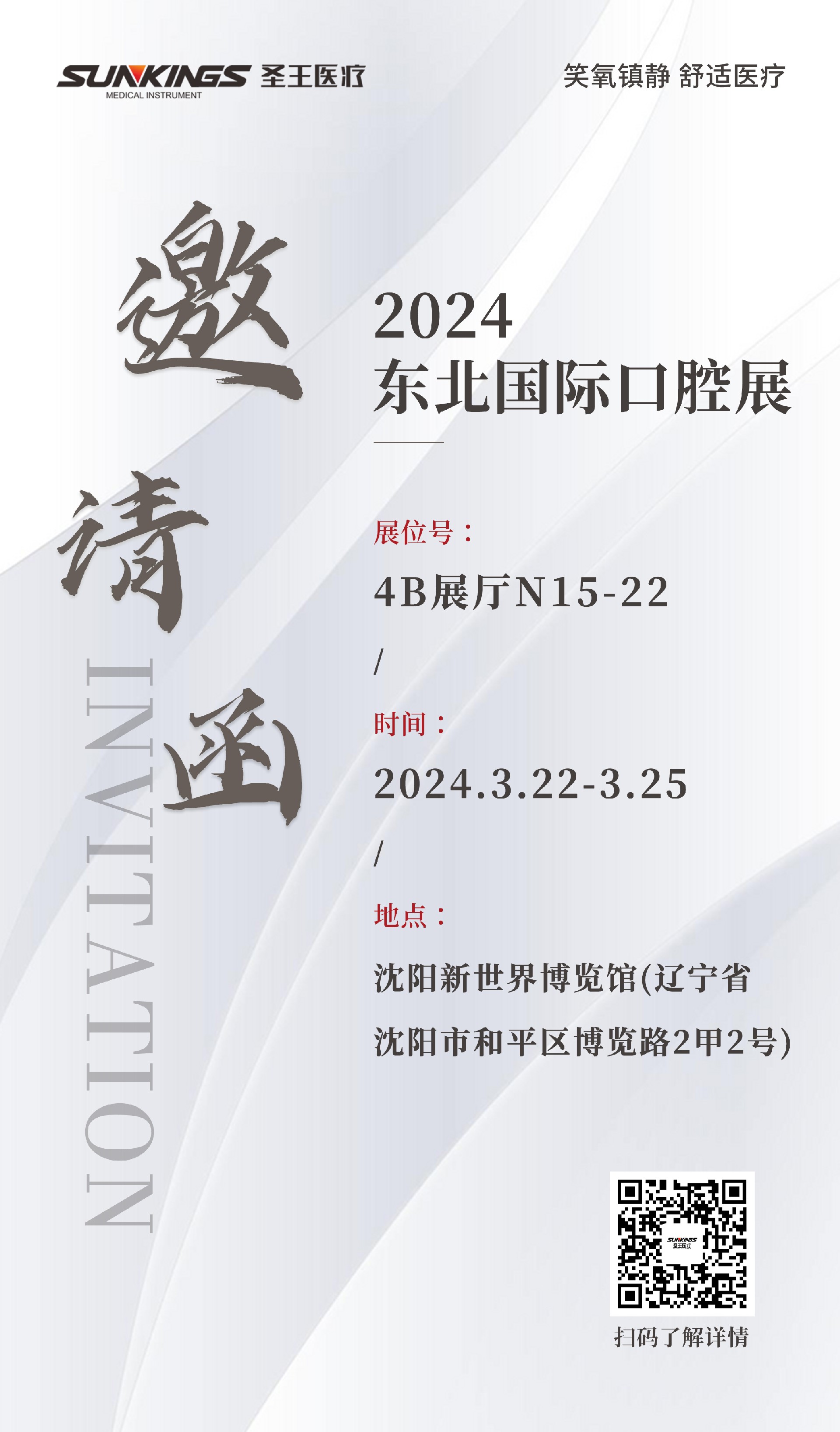 圣王醫(yī)療將于2024年3月22至25日,在沈陽新世界博覽館參展2024東北國際口腔展,展位號:4B展廳N15-22,在此誠摯地邀請全國各界的伙伴們,蒞臨現(xiàn)場。