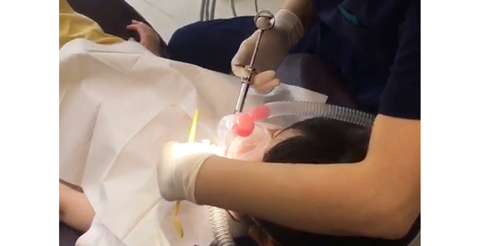 如圖患者在笑氧鎮靜下拔除多生牙。這是一位7歲左右的兒童患者,因害怕疼痛一直哭鬧、不配合治療,家長也束手無策。醫生了解后,向患者和患者家長介紹了笑氧鎮靜技術,經醫生引導,小朋友戴上鼻罩,5分鐘后,醫生注射麻藥,30分鐘拔牙結束,結束后小朋友表示:這么快就拔完了,拔牙一點都不疼。