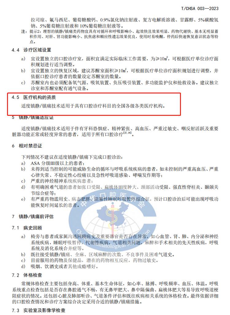 《非麻醉醫師實施口腔診療適度鎮靜/鎮痛專家共識》中指出:適度鎮靜/鎮痛技術適用于具有口腔診療科目的全國各級各類醫療機構。