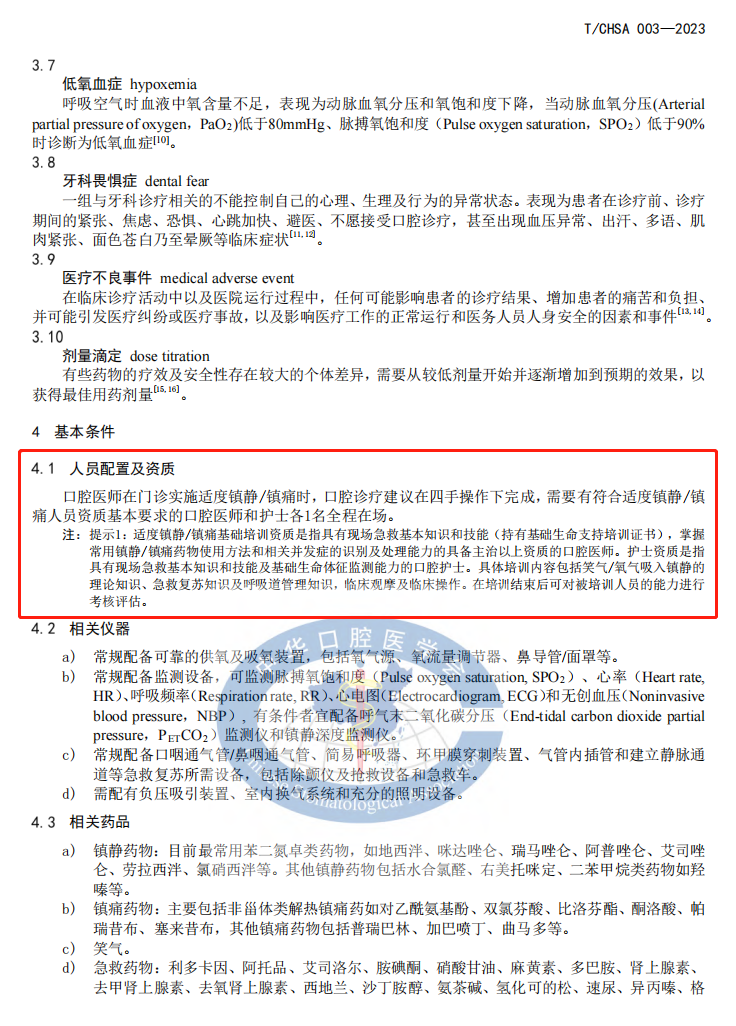 口腔診療建議在四手操作下完成,需要有符合適度鎮靜/鎮痛人員資質基本要求的口腔醫師和護士各1名全程在場。需掌握常用鎮靜/鎮痛藥物使用方法和相關并發癥的識別及處理能力的具備主治以上資質的口腔醫師,及具有現場急救基本知識和技能及基礎生命體征監測能力的口腔護士。